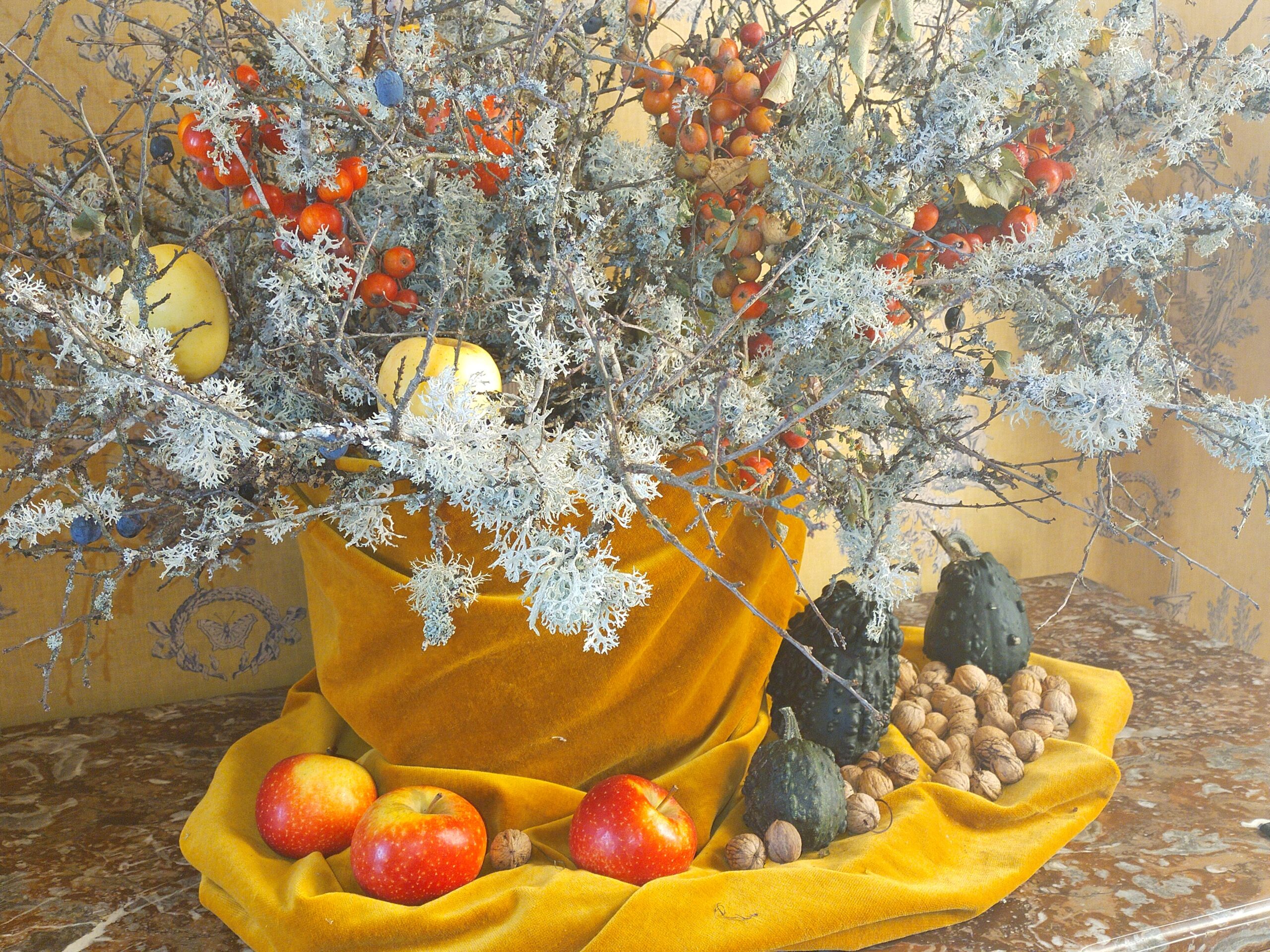 Cucurbitacées, fruits secs, fleurs séchées et feuilles mortes se mêlent dans des compositions originales automnales.
